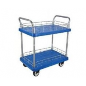 Chariot à deux étages. 150 kg de chargement. Dimensions: 910 x 600 mm. Deux roues fixes et deux roues pivotantes.